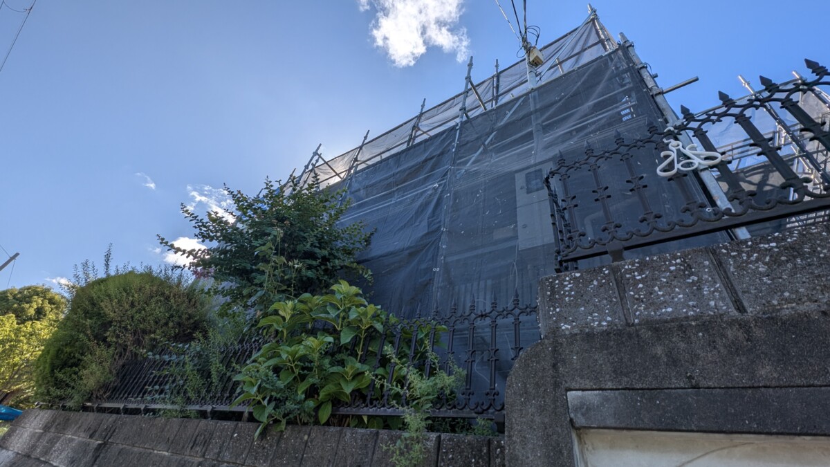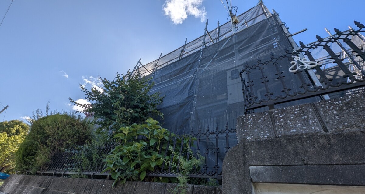 足場が組まれた我が家。