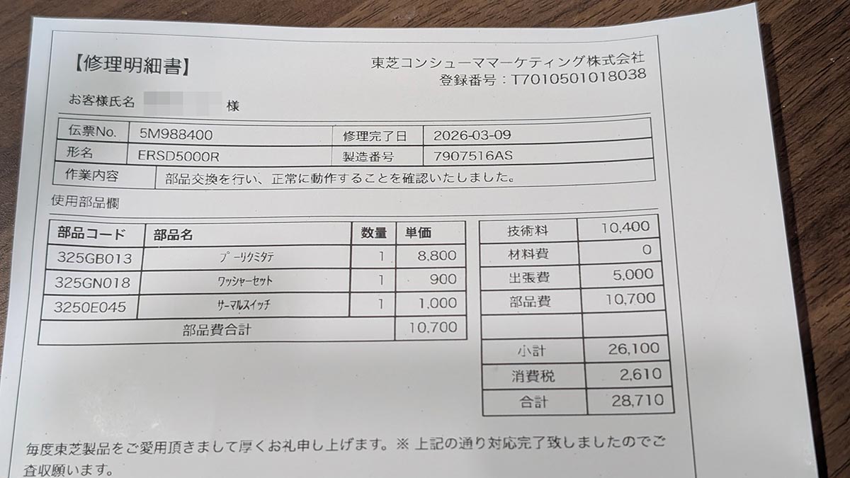 とりあえず修理にナンボかかんのじゃあ、と出張見積を東芝に依頼する。