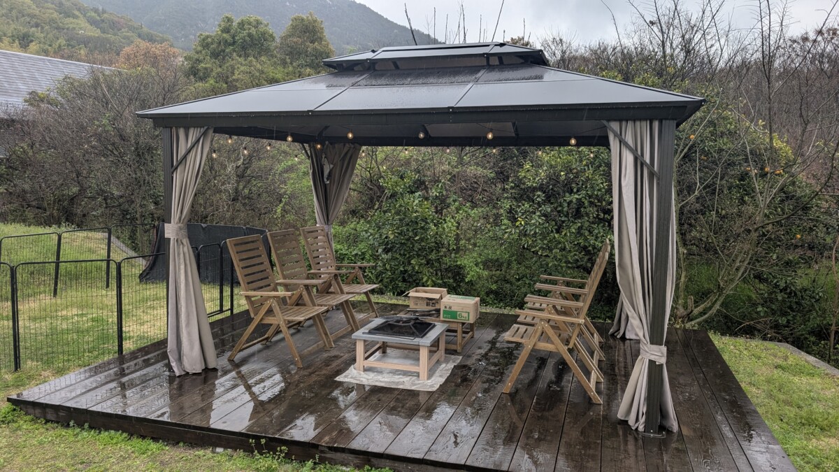 ここなら雨でも外でBBQも出来るし、何より、雨風しのげるし冷暖房完備。布団まである。