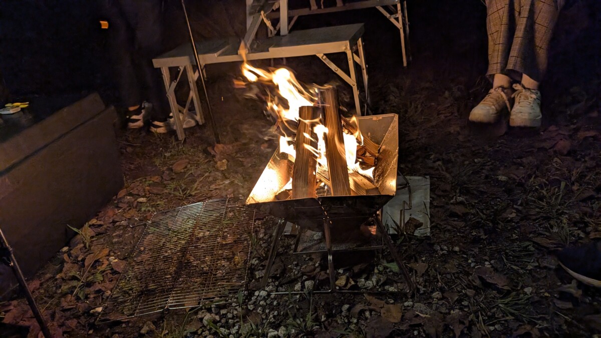 焼き網を外して焚き火台に出来るんですが、長方形だと市販の薪を割らずに放り込めるのが最大のメリット。